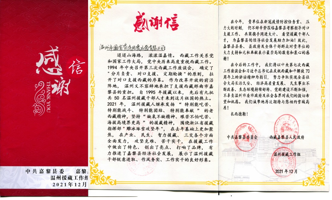 近日,中共西藏嘉黎县委员会、西藏嘉黎县人民政府、温州援藏工作组,向91网站 发来感谢信,对公司为援藏事业的真挚付出表示由衷的感谢。今年10月,公司第二次派出代表参加温州市国资系统代表团一行,赴嘉黎县开展对口支援考察调研,并捐助对口支援资金。...