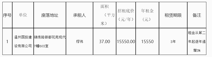 温州市国资运营公司下属温州国投建设有限公司关于银都花苑现代7幢603室房产租赁结果公示