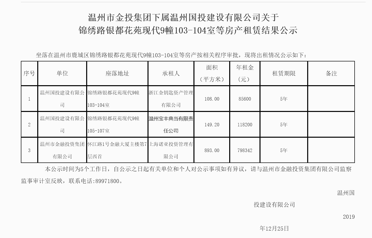 温州市金投集团下属温州国投建设有限公司关于锦绣路银都花苑现代9幢103