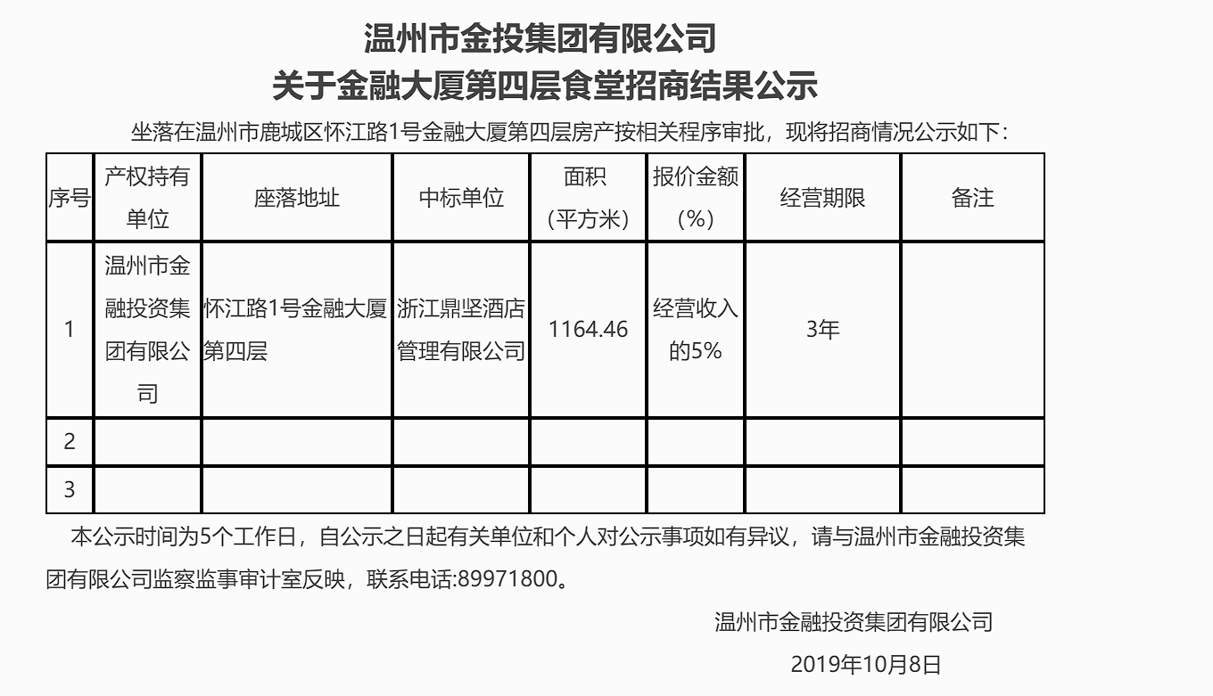 温州市金投集团有限公司关于金融大厦第四层食堂招商结果公示